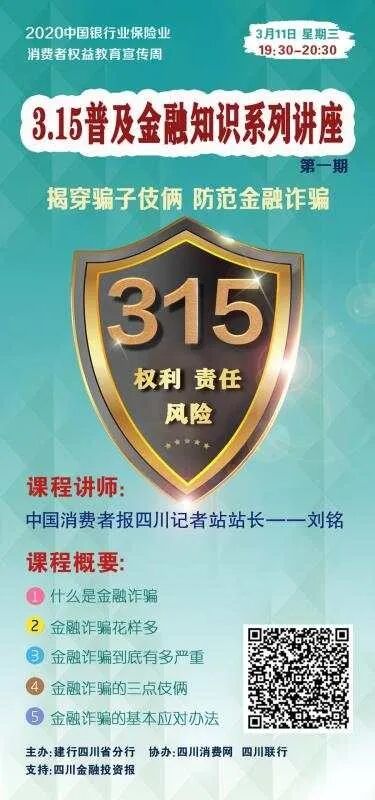 如何防止金融诈骗?个人征信有多重要?线上金融如何办理?“3.15”即将来临,中国建设银行四川分行携手四川消费网、四川联行、四川日报报业集团《金融投资报》推出的“3.15普及金融知识系列讲座”,将以生动的案例故事,系统回答广大金融消费者关心的问题。